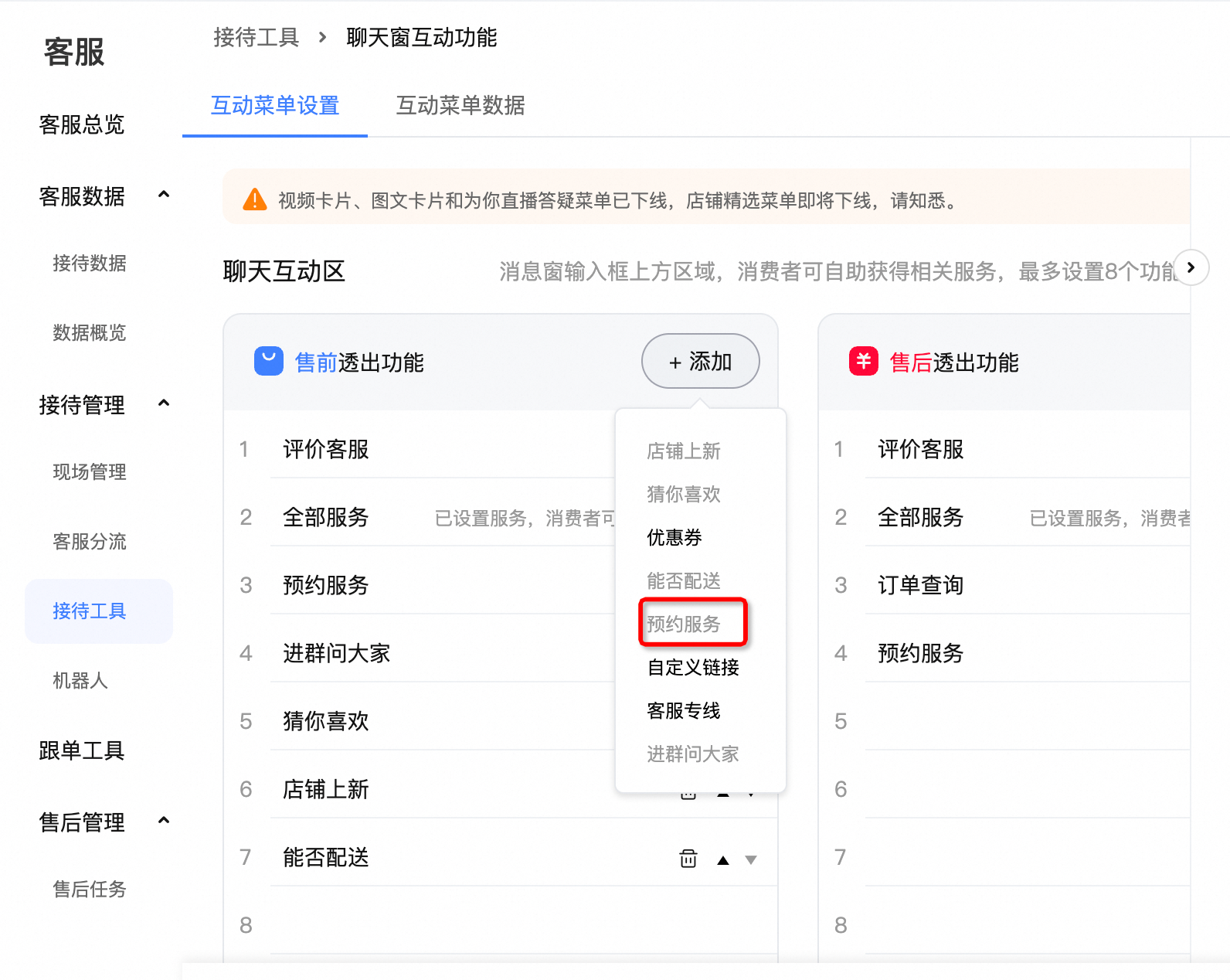 商家需要在千牛工作台【客服】-【接待工具】-【聊天窗互动功能】,售前和售后场景下,配置【预约服务】按钮。