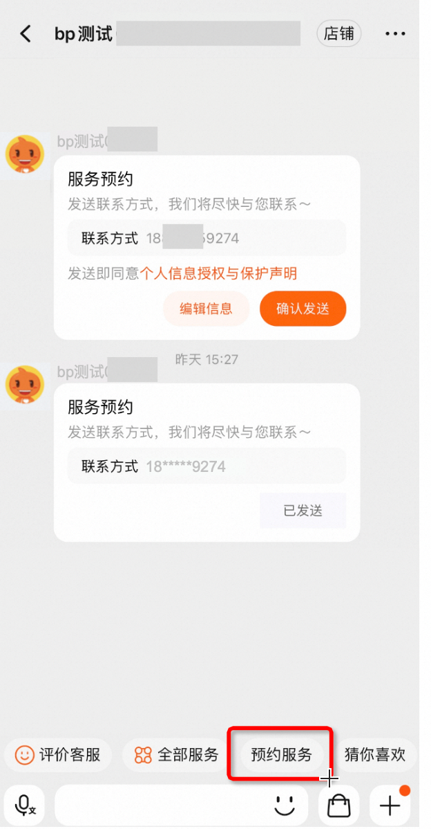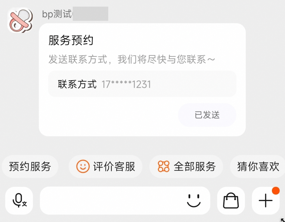 商家完成配置后,消费者可以在客服聊天框点击【预约服务】,就可以触发留资卡片。