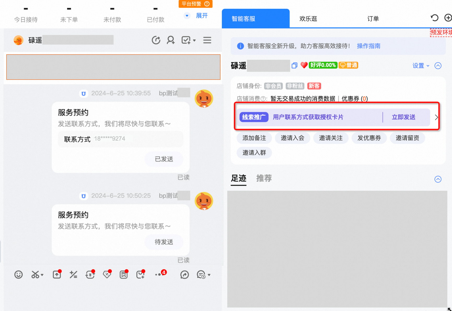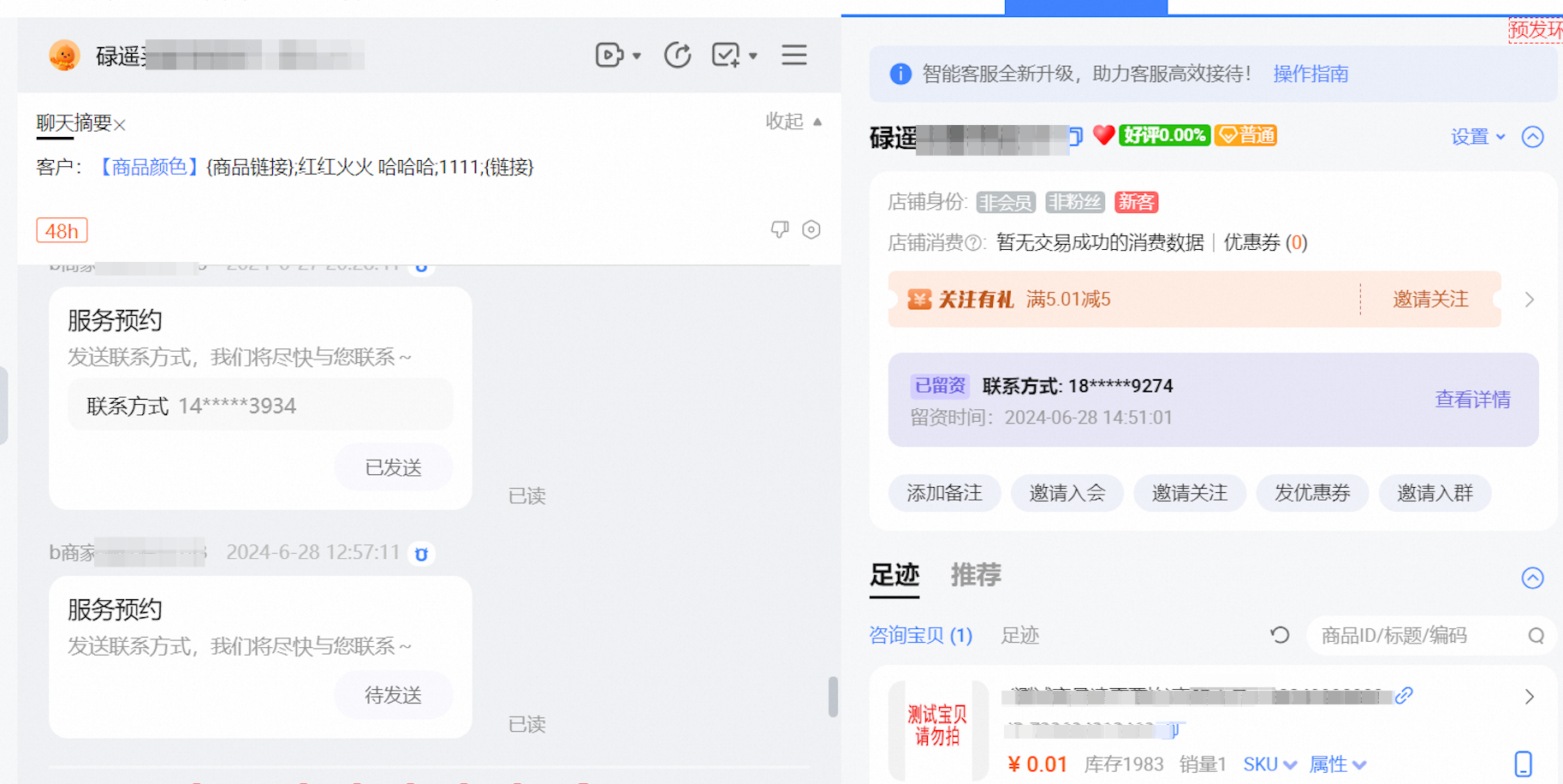 消费者留资后:聊天窗内的留资卡片展示密文联系方式。右侧客户面板展示密文留资信息(留资后需要刷新)。点击查看详情,可以跳转客户工作台使用明文线索。